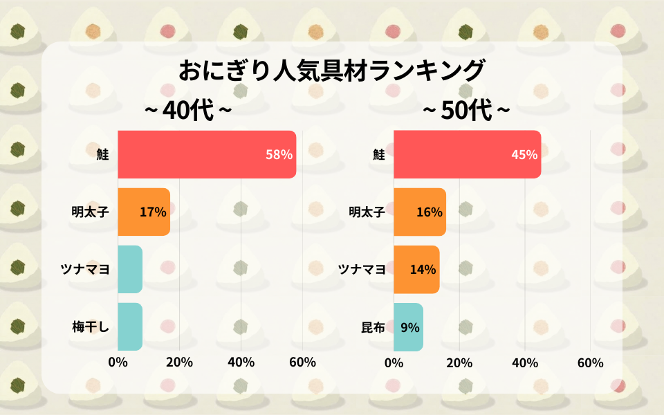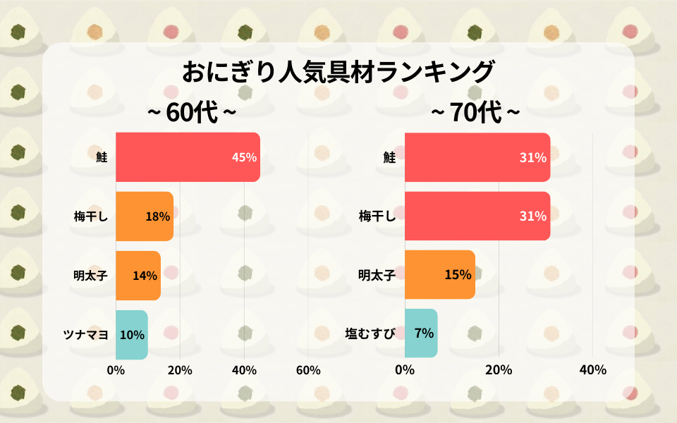 年齢が上がるにつれて、絶対的な王者である『鮭』の割合が少しずつ低下し、「梅干し」や「塩むすび」といった、さっぱり・シンプル系の支持率が増加していることがわかります。