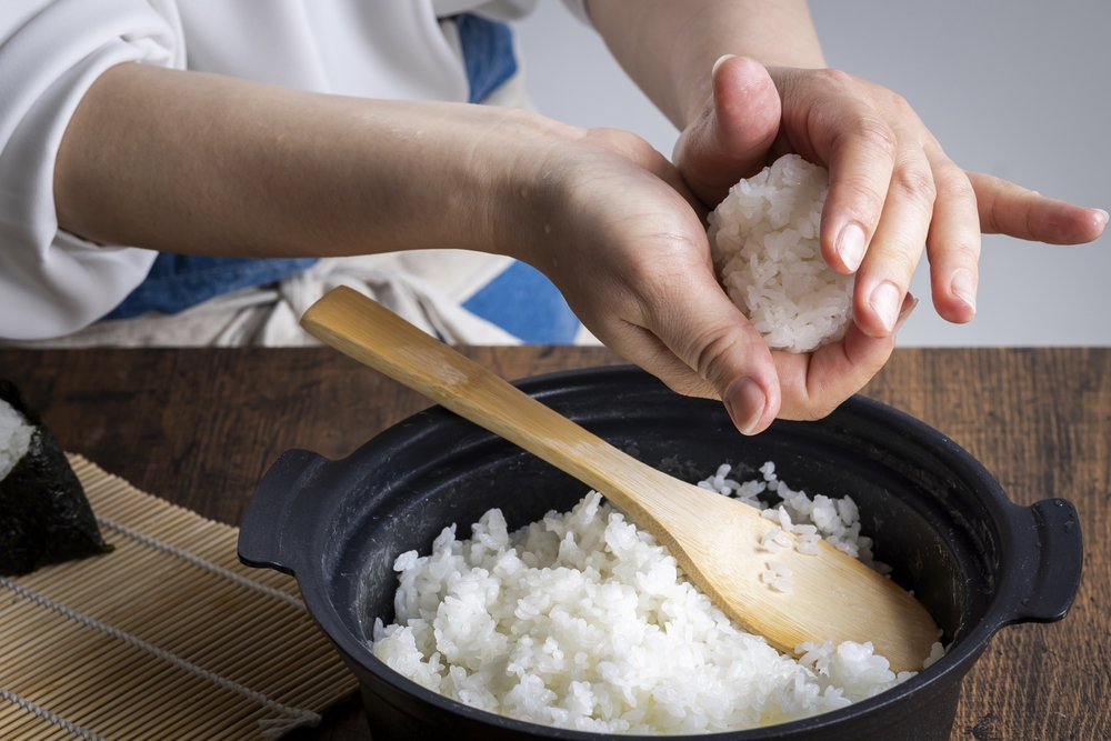 握る回数が増えるほど、お米の粒が潰れて粘り気が出てしまい、冷めた時に硬くなってしまいます。