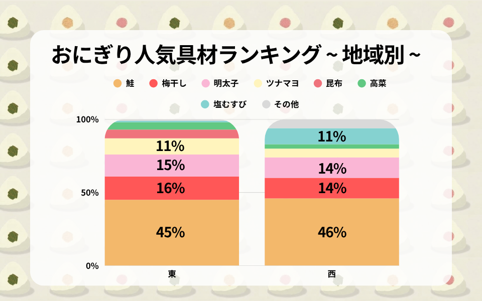 東西ともに「鮭」が45%超えで圧倒的ナンバーワン! 続く「梅干し」「明太子」も僅差でトップ3にランクインしており、ここまでは日本全国共通の王道と言えそうです。